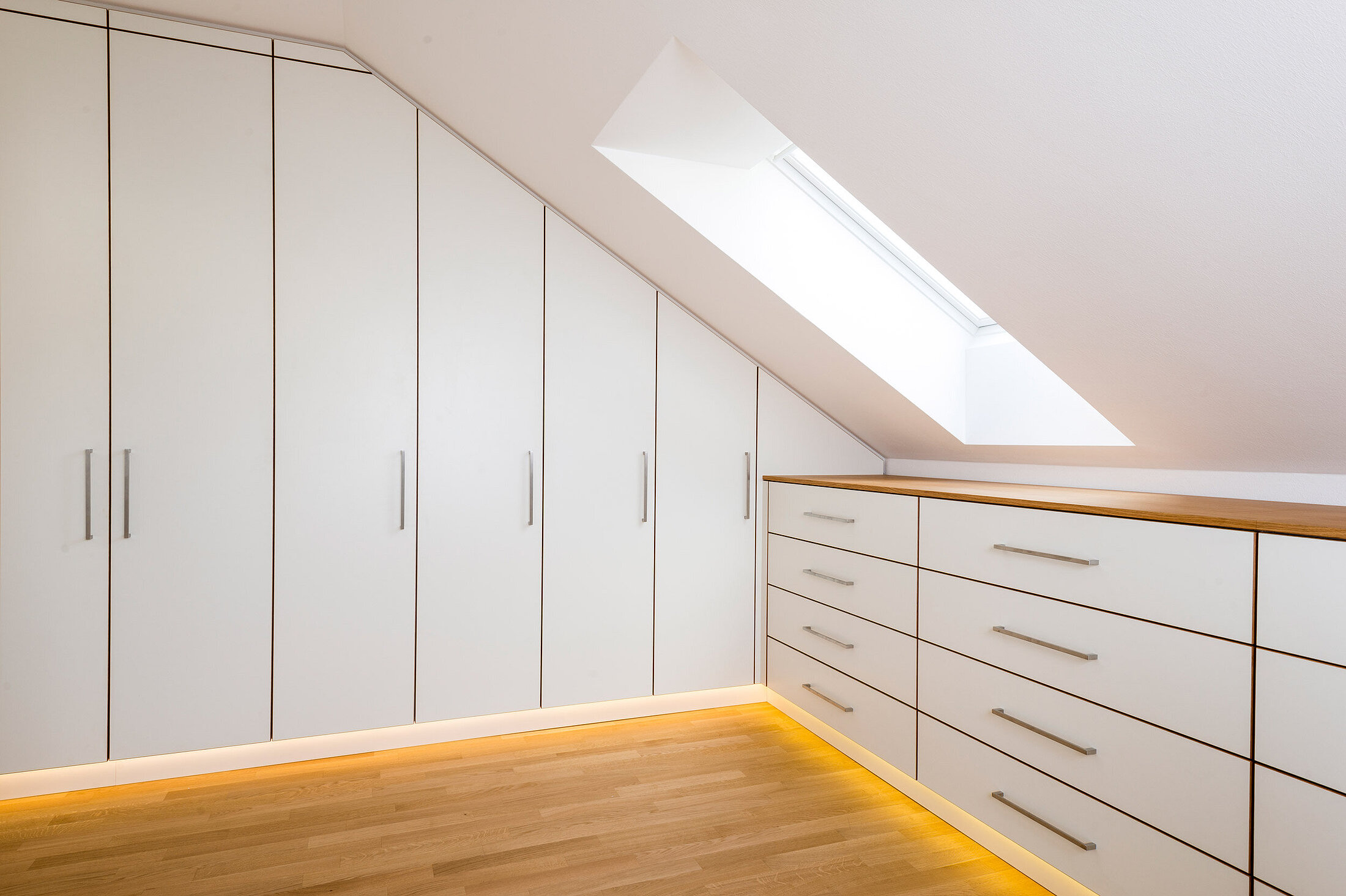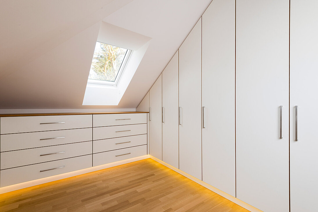 Optisch schöne Schrankwände auch bei Dachschrägen sind für uns kein Problem! Wir nutzen den verfügbaren Platz komplett aus, brauchen keine "Blende", sondern bauen Einbauschränke auf den Millimeter passgenau, so dass eine schöne Schattenfuge entsteht.