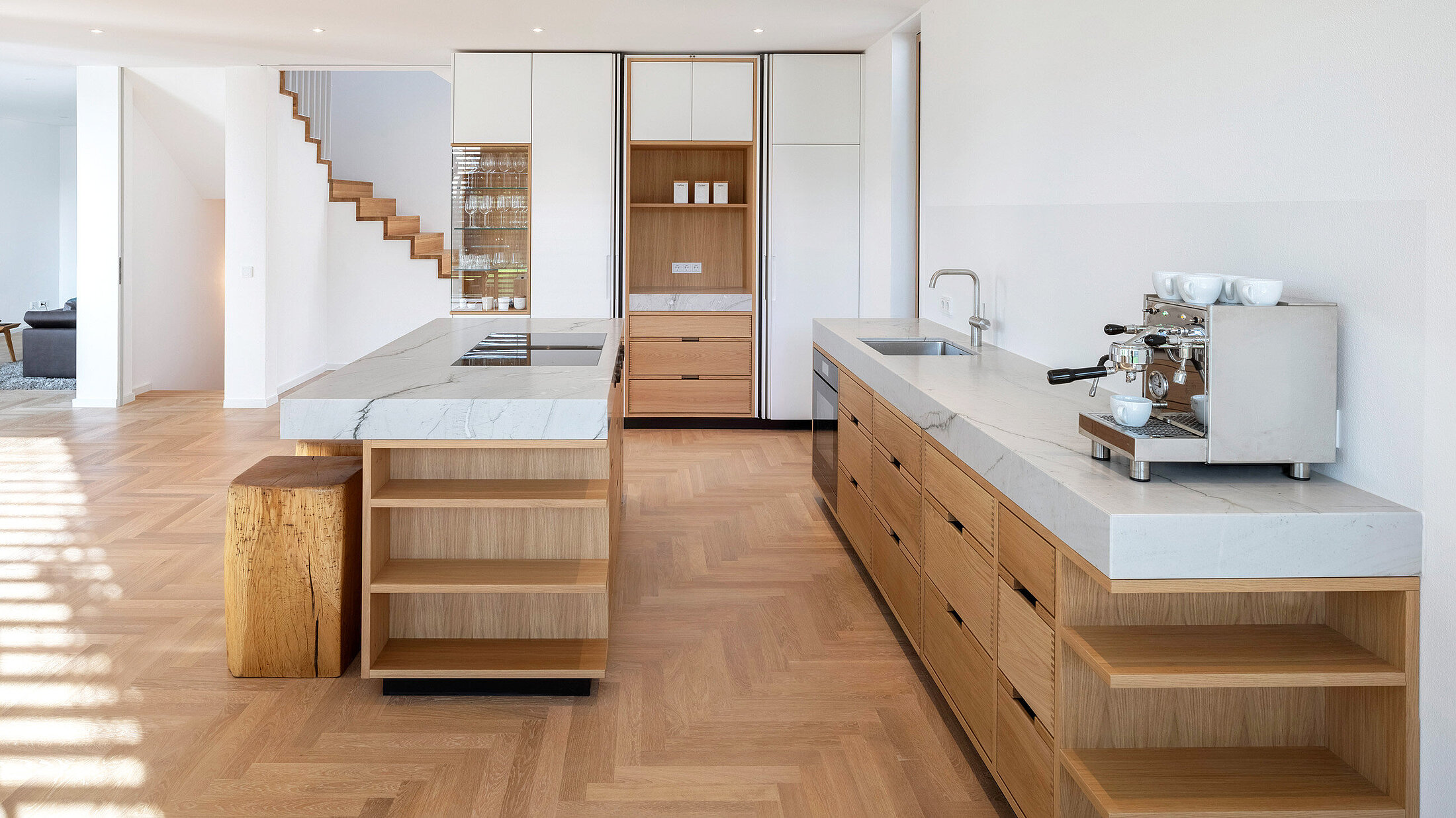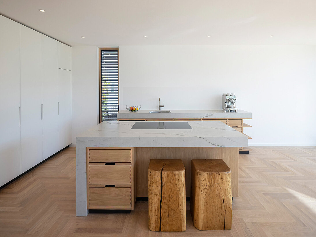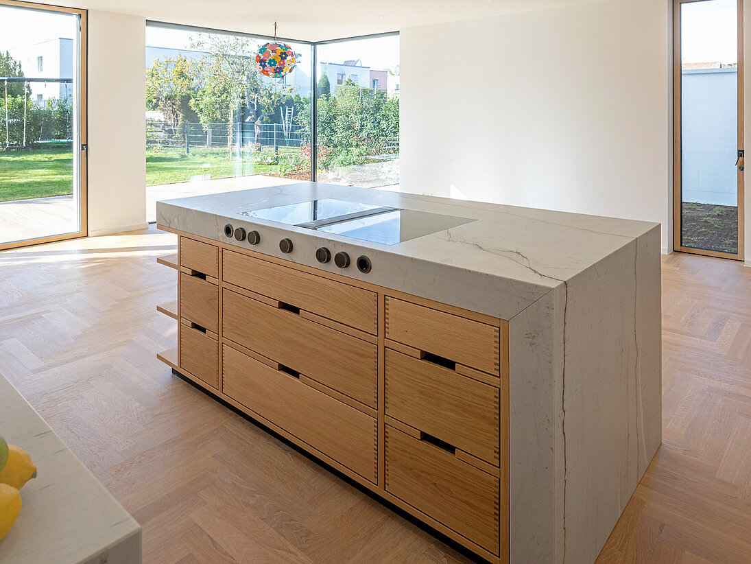 Die Wohnküche in Granit Mont Bleu und Eiche