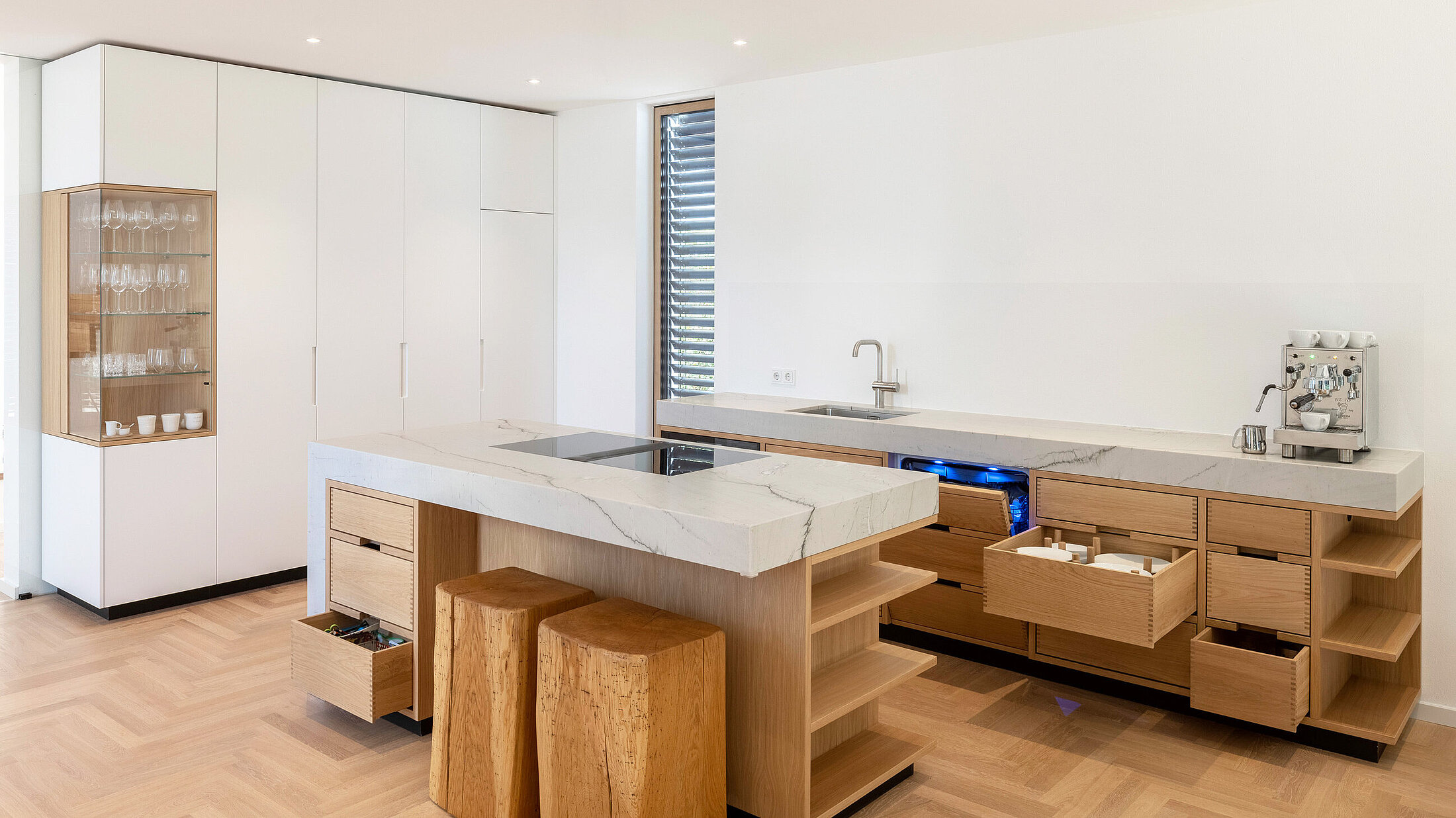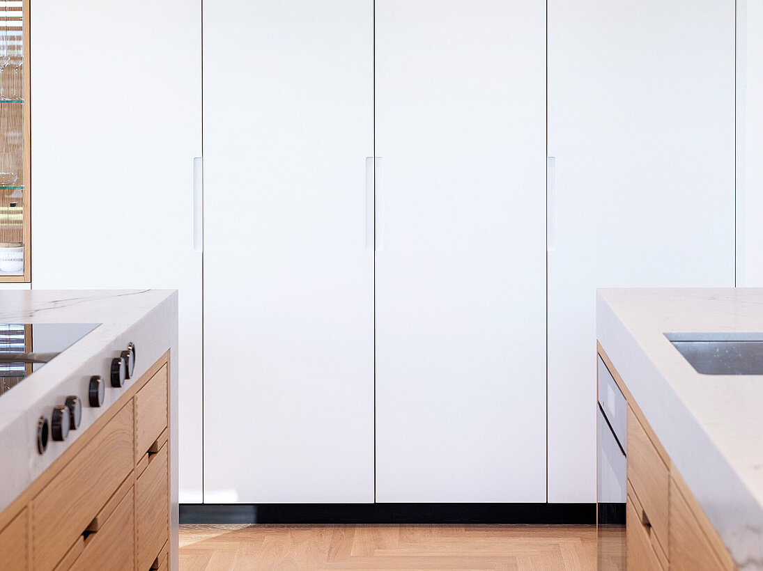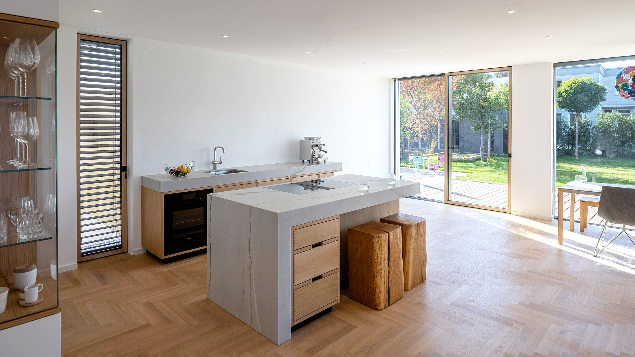 Die Wohnküche in Granit Mont Bleu und Eiche